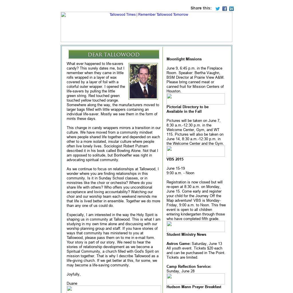 Especially, I am interested in the way the Holy Spirit is shaping us in community at Tallowood. This is what I am studying in my own time alone and discussing with our worship planning group and staff. If you have stories of ways that community has ministered to you at Tallowood, please pass them on to me in e-mail form. Your story is part of our story. We need to hear the stories of relationship development as we become a Spiritual Community, a church filled with God's Spirit on mission together. That is why I describe Tallowood as a life-giving church. If we get better at this, for some, we may become a life-saving community.