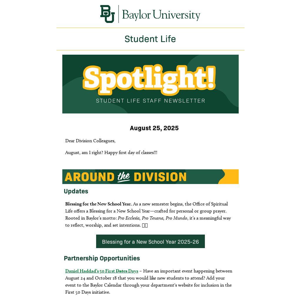 Blessing for the New School Year. As a new semester begins, the Office of Spiritual Life offers a Blessing for a New School Year—crafted for personal or group prayer. Rooted in Baylor’s motto: Pro Ecclesia, Pro Texana, Pro Mundo, it’s a meaningful way to reflect, worship, and set intentions. 🙏💚