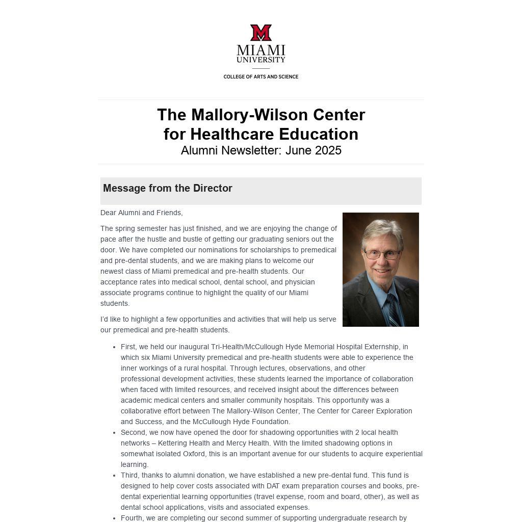 These opportunities all help us accomplish the mission or the Mallory-Wilson Center, to “enhance and enrich premedical and pre-health education at Miami University by providing the resources, information, and support that enable students interested in a career in healthcare to make informed decisions about their professional goals and to develop a plan to achieve those goals.”