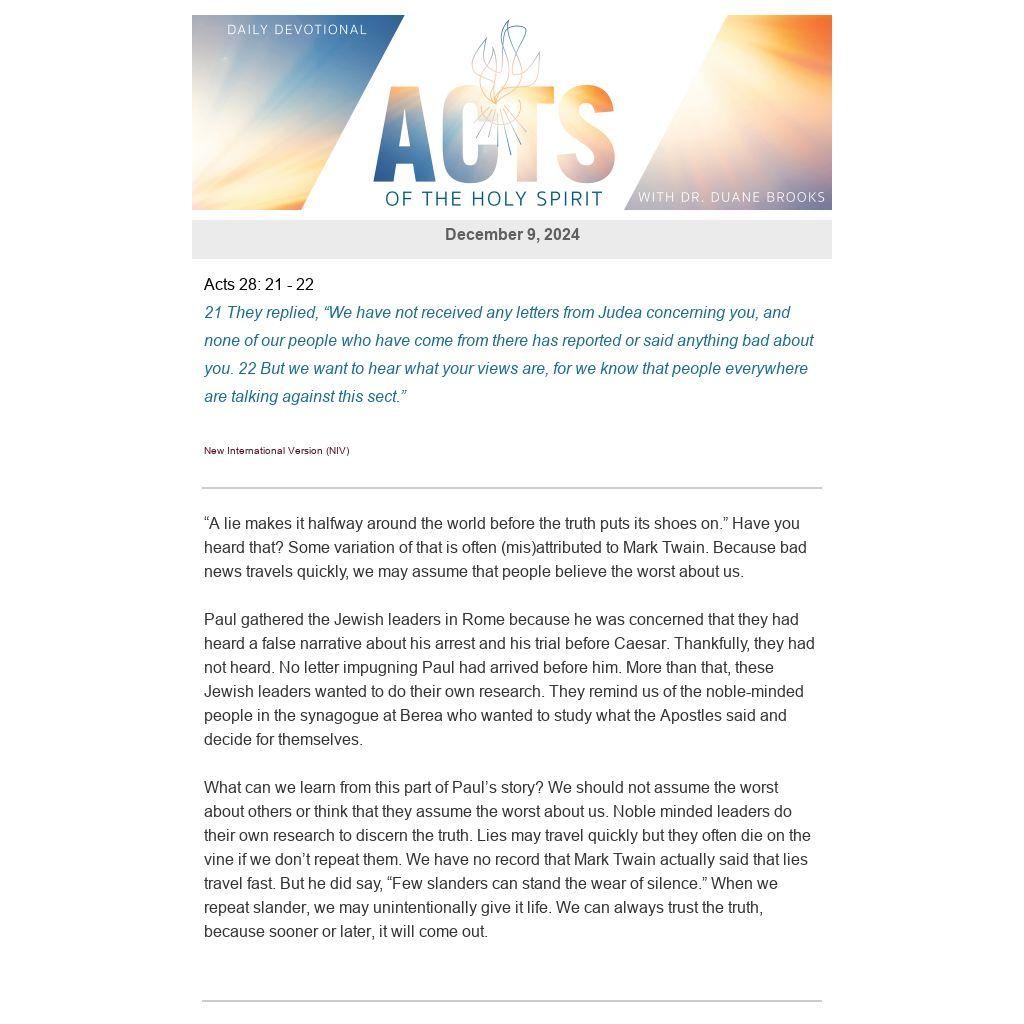 What can we learn from this part of Paul’s story? We should not assume the worst about others or think that they assume the worst about us. Noble minded leaders do their own research to discern the truth. Lies may travel quickly but they often die on the vine if we don’t repeat them. We have no record that Mark Twain actually said that lies travel fast. But he did say, “Few slanders can stand the wear of silence.” When we repeat slander, we may unintentionally give it life. We can always trust the truth, because sooner or later, it will come out.