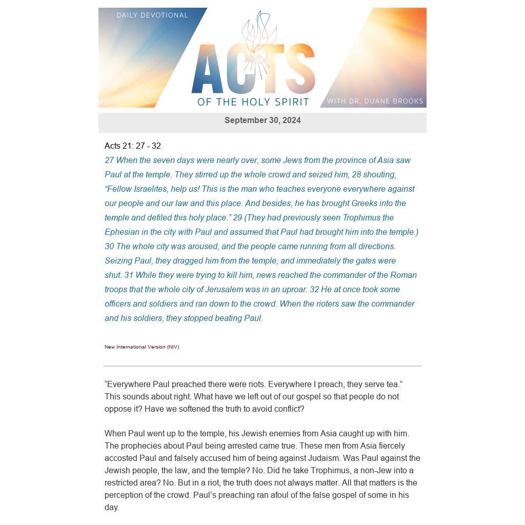 When Paul went up to the temple, his Jewish enemies from Asia caught up with him. The prophecies about Paul being arrested came true. These men from Asia fiercely accosted Paul and falsely accused him of being against Judaism. Was Paul against the Jewish people, the law, and the temple? No. Did he take Trophimus, a non-Jew into a restricted area? No. But in a riot, the truth does not always matter. All that matters is the perception of the crowd. Paul’s preaching ran afoul of the false gospel of some in his day.