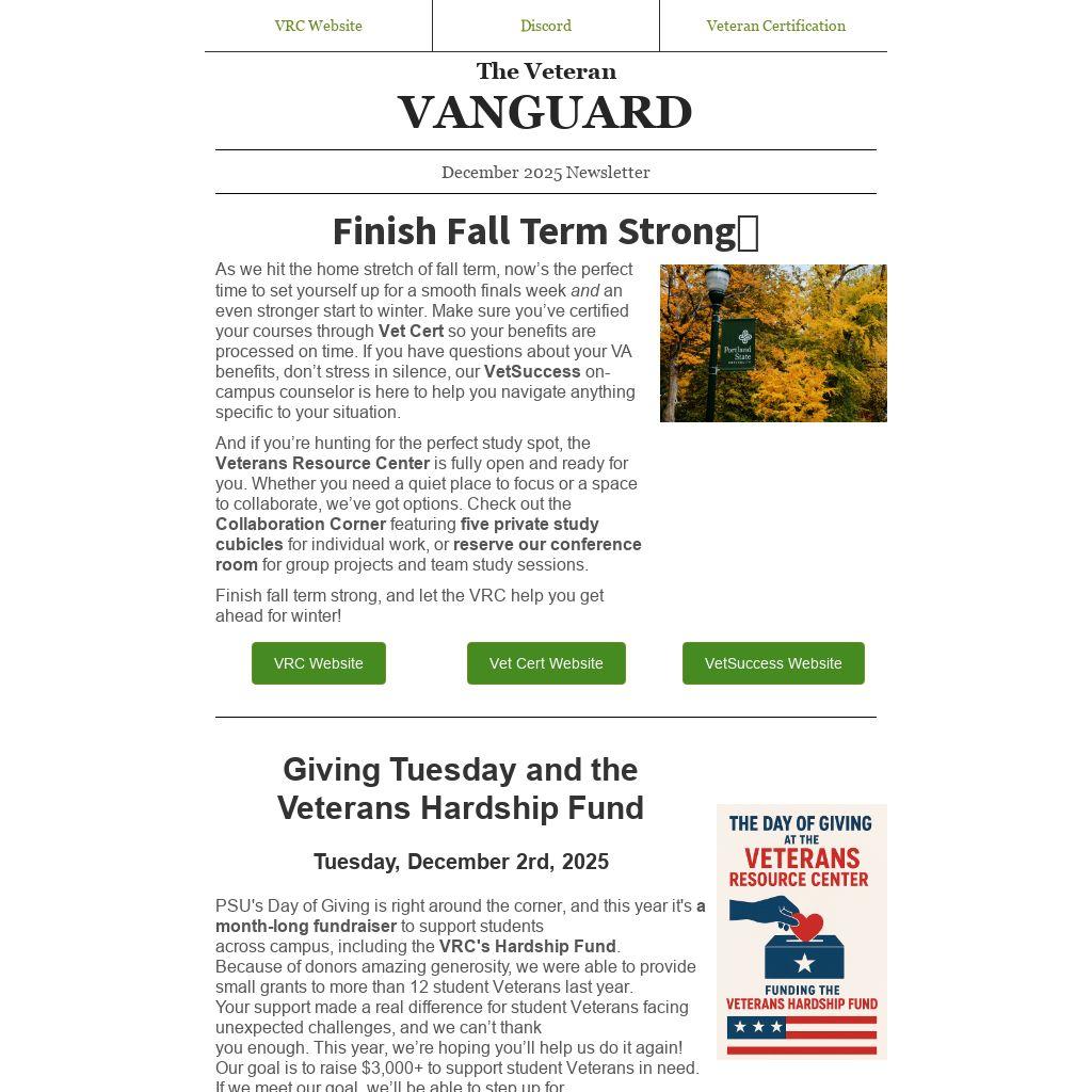 As we hit the home stretch of fall term, now’s the perfect time to set yourself up for a smooth finals week and an even stronger start to winter. Make sure you’ve certified your courses through Vet Cert so your benefits are processed on time. If you have questions about your VA benefits, don’t stress in silence, our VetSuccess on-campus counselor is here to help you navigate anything specific to your situation.