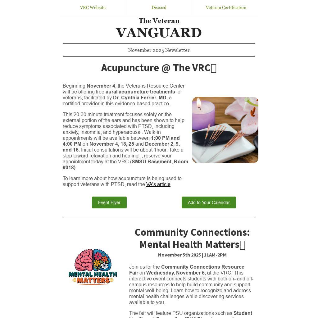 Beginning November 4, the Veterans Resource Center will be offering free aural acupuncture treatments for veterans, facilitated by Dr. Cynthia Ferrier, MD, a certified provider in this evidence-based practice.