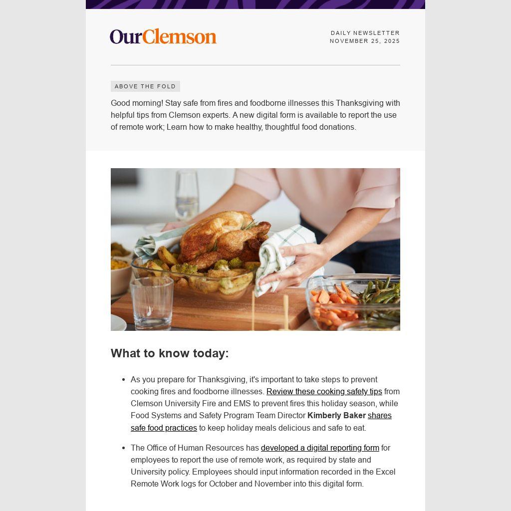 Good morning! Stay safe from fires and foodborne illnesses this Thanksgiving with helpful tips from Clemson experts. A new digital form is available to report the use of remote work; Learn how to make healthy, thoughtful food donations.
