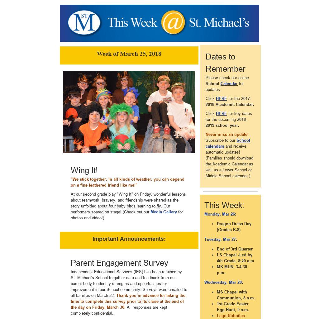 Parent Engagement SurveyIndependent Educational Services (IES) has been retained by St. Michael's School to gather data and feedback from our parent body to identify strengths and opportunities for improvement in our School community. Surveys were emailed to all families on March 22. Thank you in advance for taking the time to complete this survey prior to its close at the end of the day on Friday, March 30. All responses are kept completely confidential.