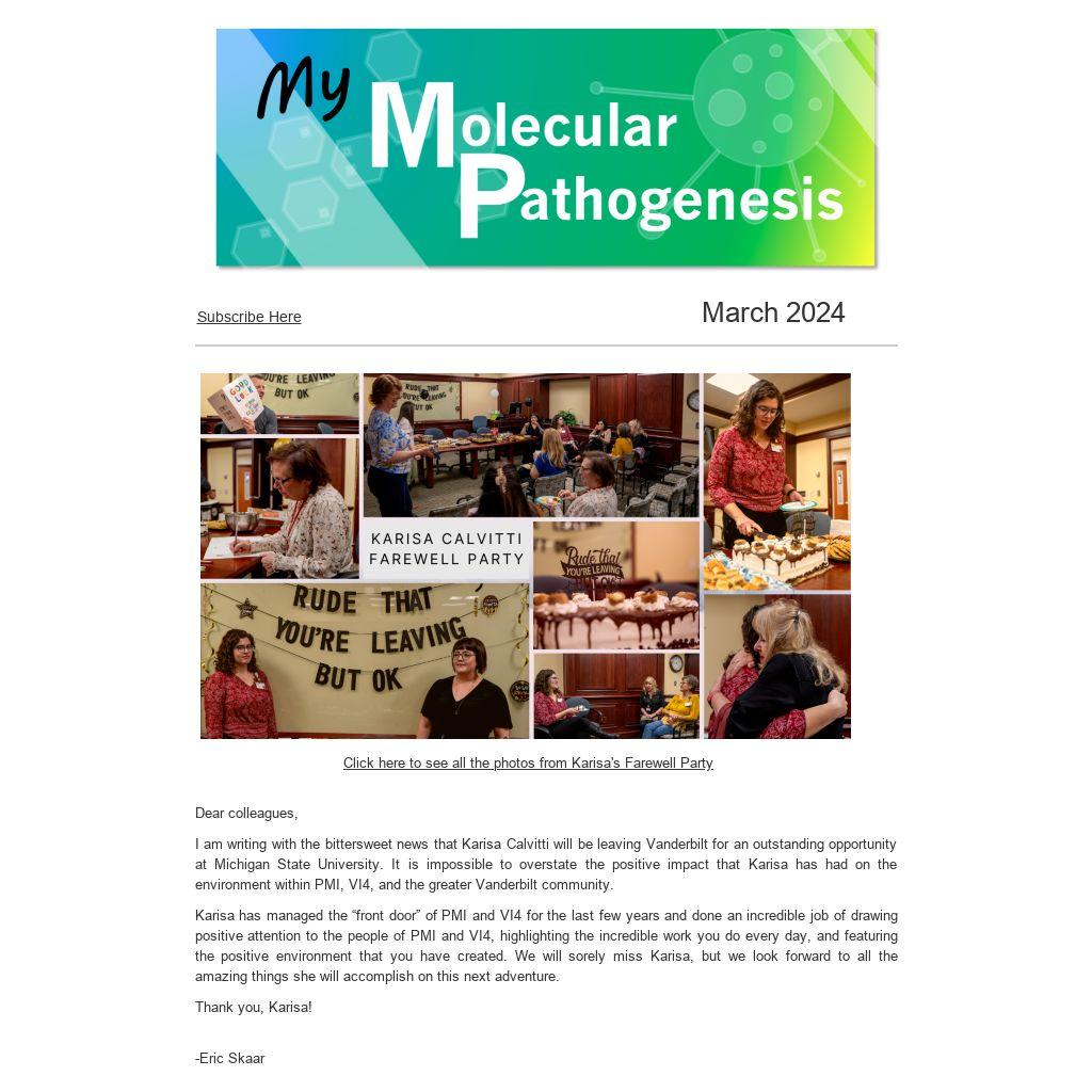 I am writing with the bittersweet news that Karisa Calvitti will be leaving Vanderbilt for an outstanding opportunity at Michigan State University. It is impossible to overstate the positive impact that Karisa has had on the environment within PMI, VI4, and the greater Vanderbilt community.
