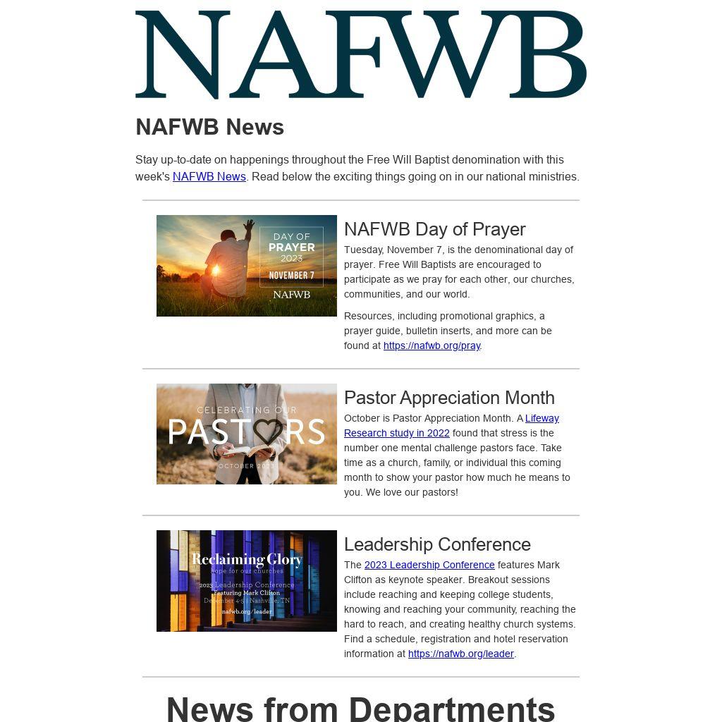 The 2023 Leadership Conference features Mark Clifton as keynote speaker. Breakout sessions include reaching and keeping college students, knowing and reaching your community, reaching the hard to reach, and creating healthy church systems. Find a schedule, registration and hotel reservation information at https://nafwb.org/leader.