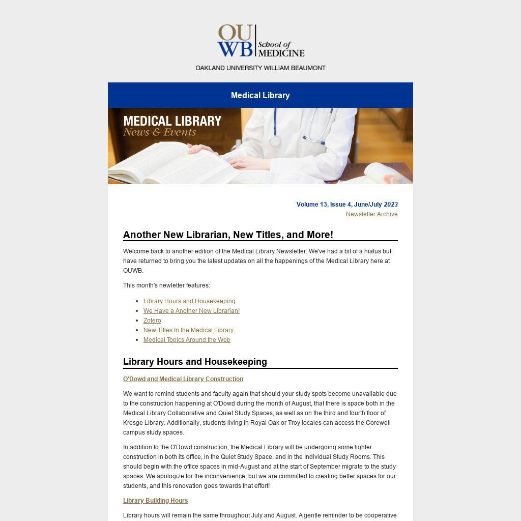 We want to remind students and faculty again that should your study spots become unavailable due to the construction happening at O'Dowd during the month of August, that there is space both in the Medical Library Collaborative and Quiet Study Spaces, as well as on the third and fourth floor of Kresge Library. Additionally, students living in Royal Oak or Troy locales can access the Corewell campus study spaces.