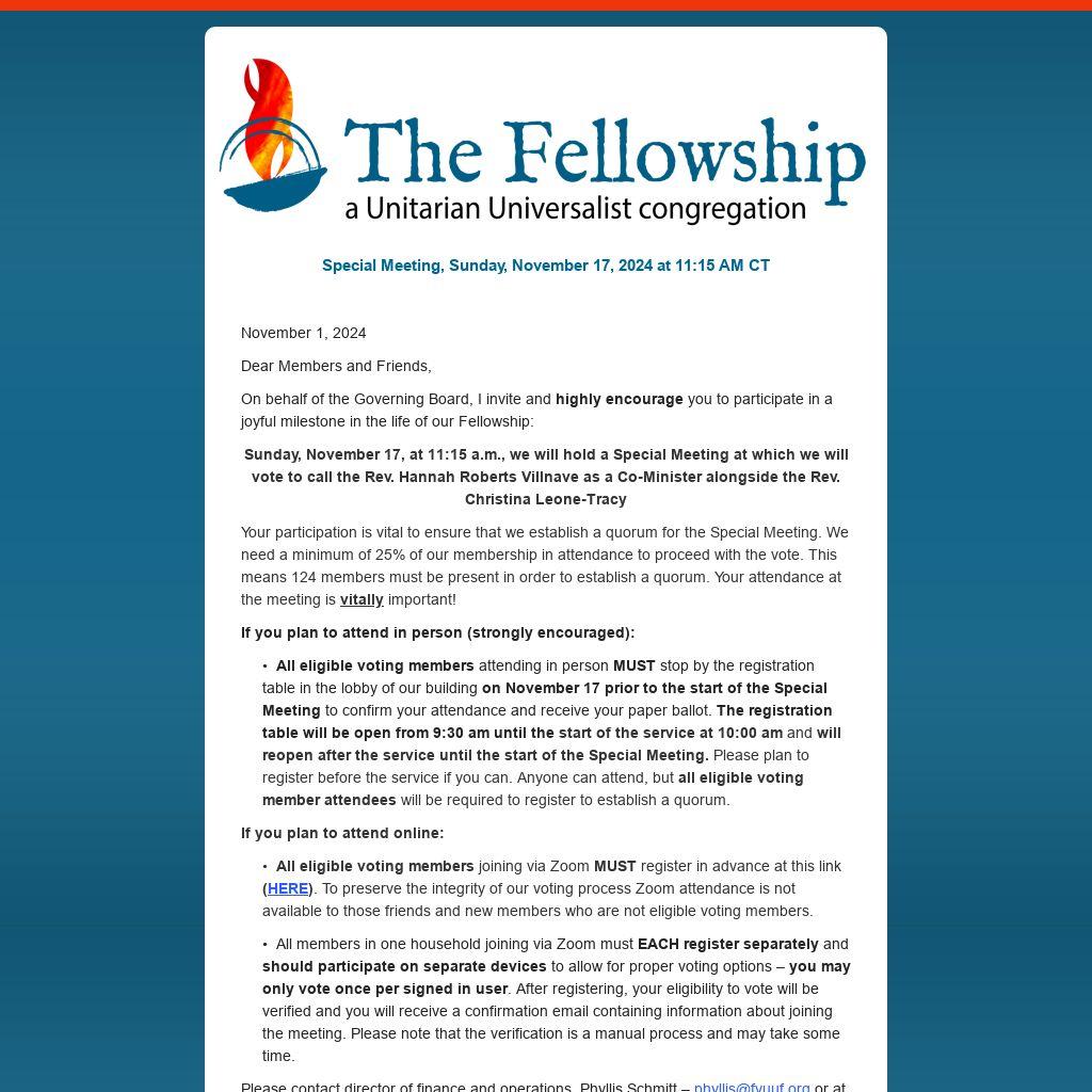 Sunday, November 17, at 11:15 a.m., we will hold a Special Meeting at which we will vote to call the Rev. Hannah Roberts Villnave as a Co-Minister alongside the Rev. Christina Leone-Tracy