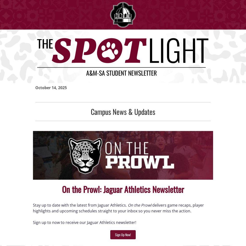 The Spotlight is the campus newsletter for the students of Texas A&M-San Antonio. The Spotlight is published every Tuesday from the start of the semester, providing insight into A&M-SA news, events, and announcements. If you would like to promote a University-wide event or announcement in The Spotlight, submit this form by 5 p.m. CT on a Monday the week before publication.