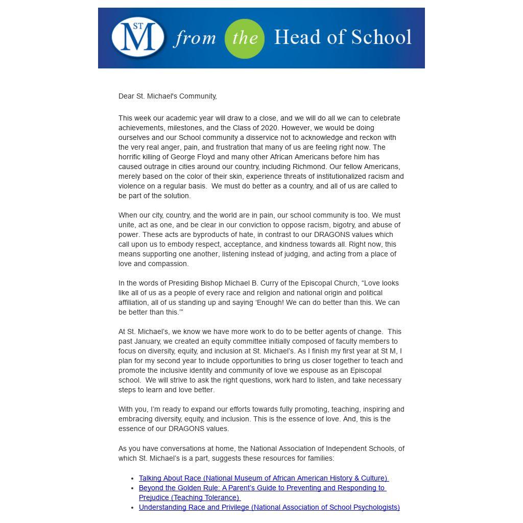 This week our academic year will draw to a close, and we will do all we can to celebrate achievements, milestones, and the Class of 2020. However, we would be doing ourselves and our School community a disservice not to acknowledge and reckon with the very real anger, pain, and frustration that many of us are feeling right now. The horrific killing of George Floyd and many other African Americans before him has caused outrage in cities around our country, including Richmond. Our fellow Americans, merely based on the color of their skin, experience threats of institutionalized racism and violence on a regular basis. We must do better as a country, and all of us are called to be part of the solution.