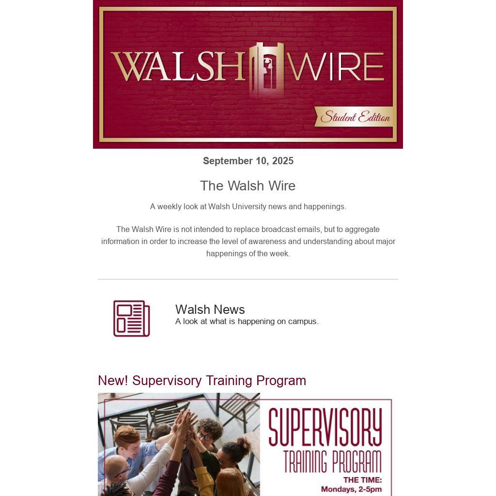 Walsh University is proud to partner with the Canton Chamber of Commerce to launch a new Supervisory Training Program beginning Oct. 6. Designed to strengthen leadership skills and support workforce development in our region, the program offers seven interactive workshop-style sessions led by Walsh faculty experts. With a limited cohort of 20 participants, supervisors and aspiring supervisors will gain practical tools, expand their leadership capacity, and build valuable connections with peers. Registration is now open through the Canton Chamber of Commerce. | Register Here