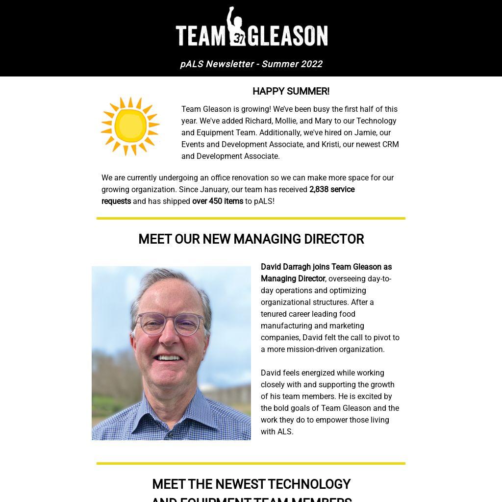 David feels energized while working closely with and supporting the growth of his team members. He is excited by the bold goals of Team Gleason and the work they do to empower those living with ALS.