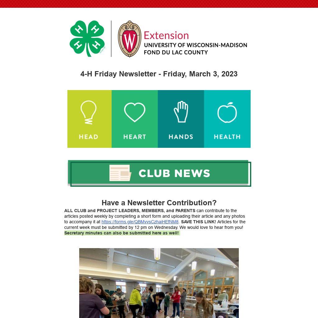 | Office UpdateTracy will be out on family leave until March 13. If you need anything while she is out, please contact Tina at the office via phone (920) 929-3171 or via email at tina.engelhardt@wisc.edu. During Tracy's absence, the 4-H Friday will be sent out twice a month. This will help provide updates in a timely manner. If you have items that need to be sent out in the newsletters, please continue to submit them via the Google form or email Tina.