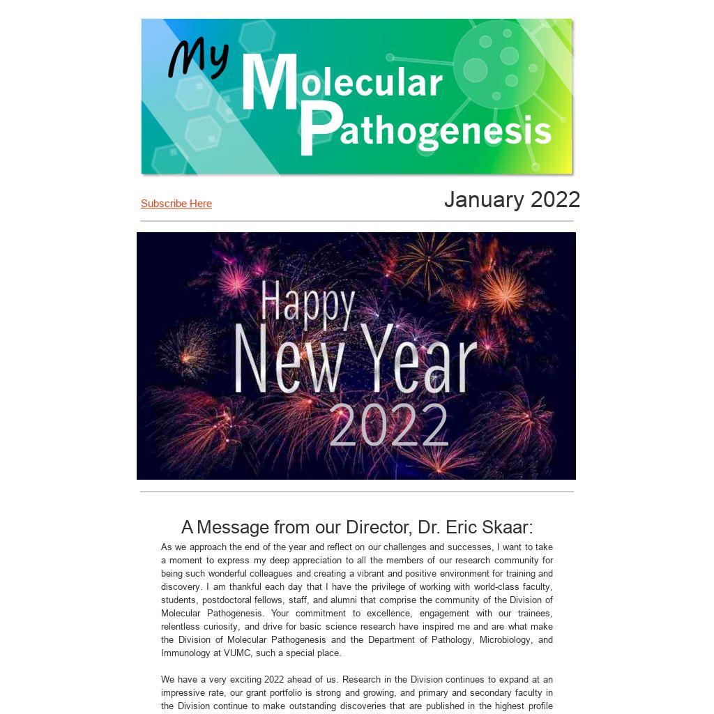 A Message from our Director, Dr. Eric Skaar:As we approach the end of the year and reflect on our challenges and successes, I want to take a moment to express my deep appreciation to all the members of our research community for being such wonderful colleagues and creating a vibrant and positive environment for training and discovery. I am thankful each day that I have the privilege of working with world-class faculty, students, postdoctoral fellows, staff, and alumni that comprise the community of the Division of Molecular Pathogenesis. Your commitment to excellence, engagement with our trainees, relentless curiosity, and drive for basic science research have inspired me and are what make the Division of Molecular Pathogenesis and the Department of Pathology, Microbiology, and Immunology at VUMC, such a special place.