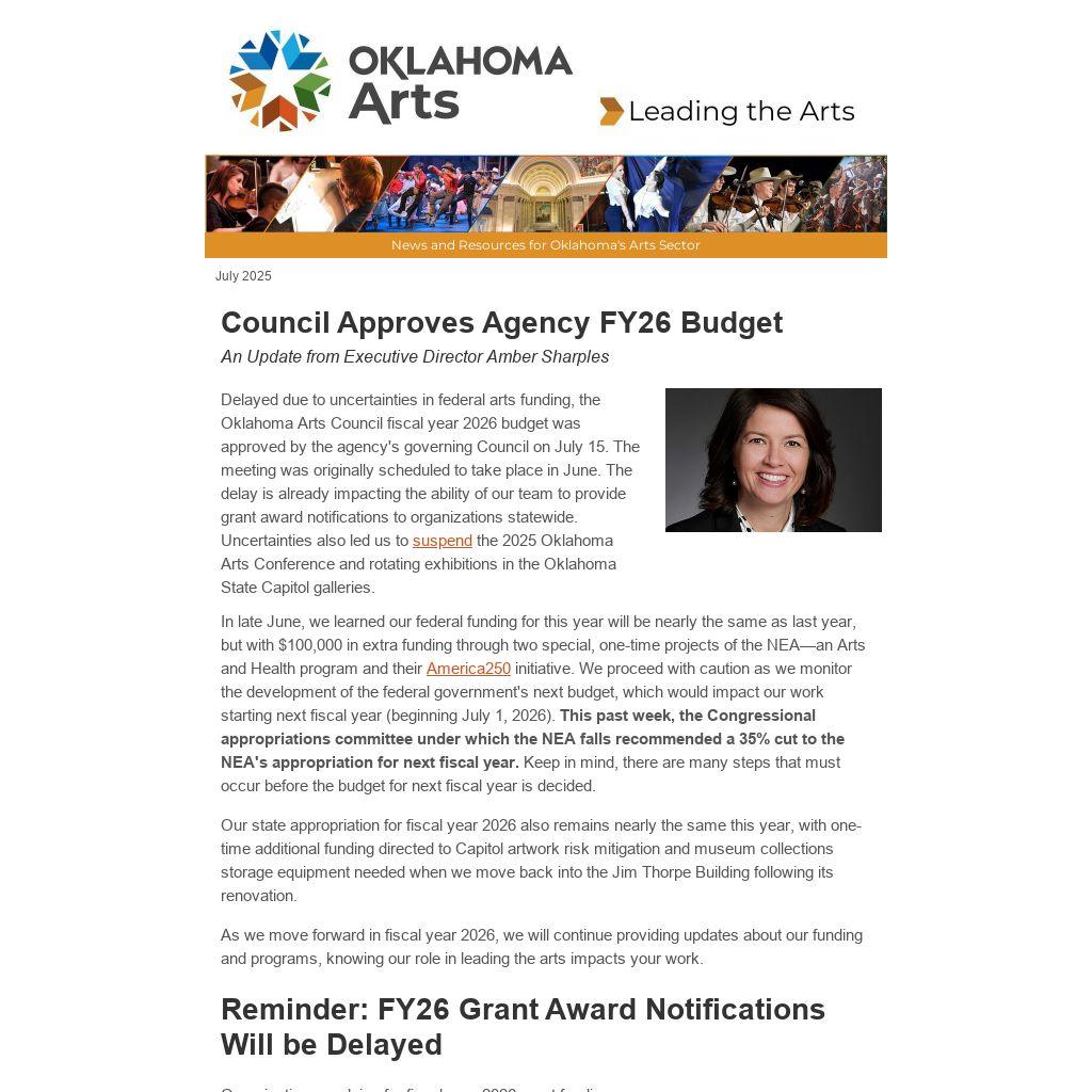 Delayed due to uncertainties in federal arts funding, the Oklahoma Arts Council fiscal year 2026 budget was approved by the agency's governing Council on July 15. The meeting was originally scheduled to take place in June. The delay is already impacting the ability of our team to provide grant award notifications to organizations statewide. Uncertainties also led us to suspend the 2025 Oklahoma Arts Conference and rotating exhibitions in the Oklahoma State Capitol galleries.