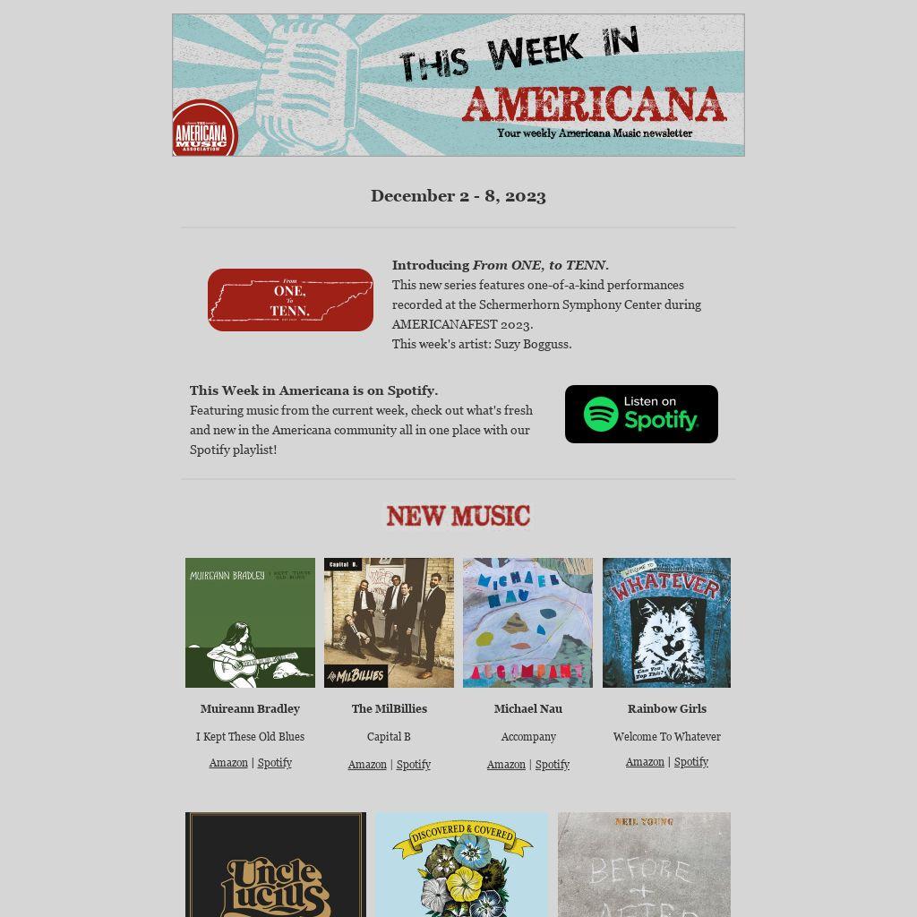 This Week in Americana is on Spotify. Featuring music from the current week, check out what's fresh and new in the Americana community all in one place with our Spotify playlist!