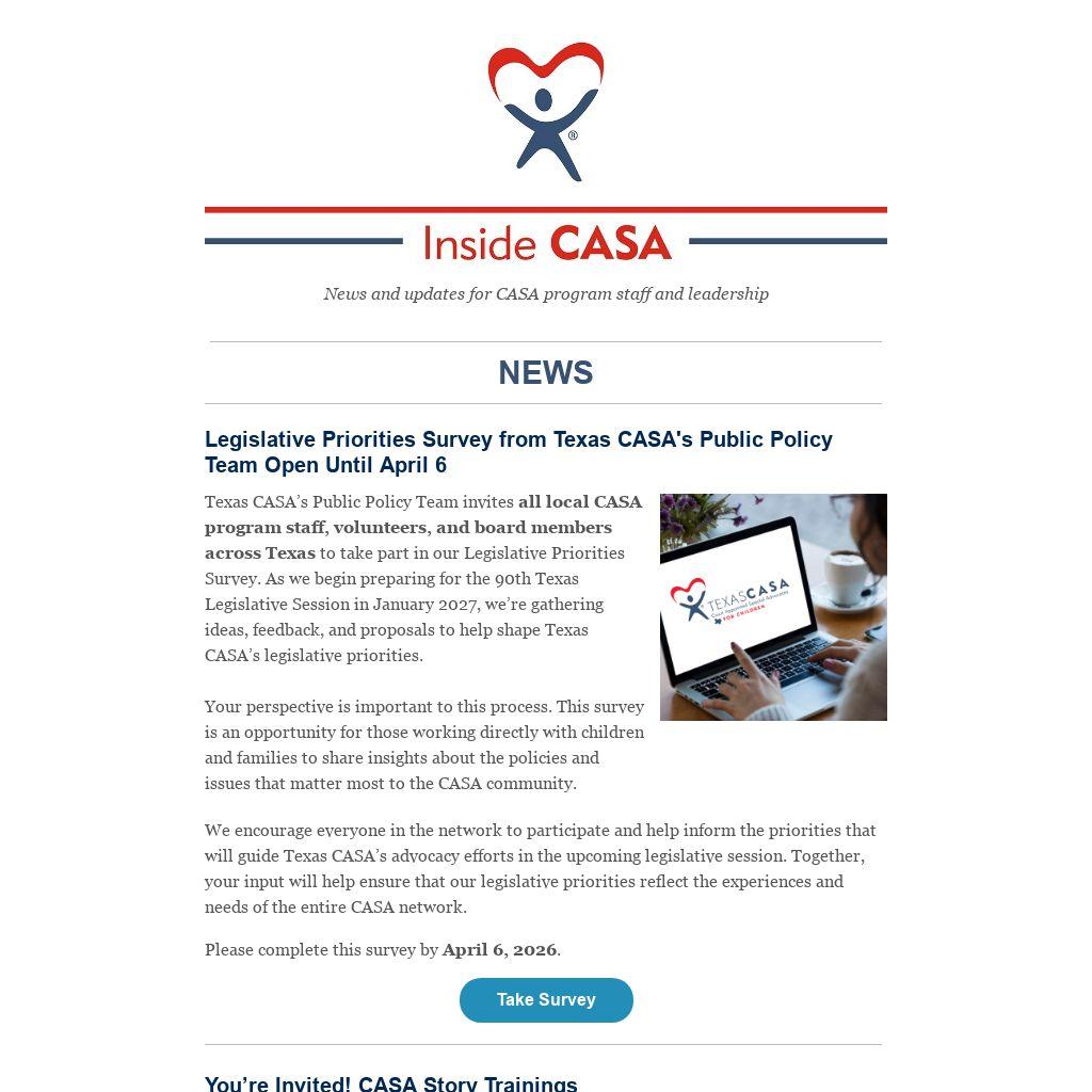 Legislative Priorities Survey from Texas CASA's Public Policy Team Open Until April 6