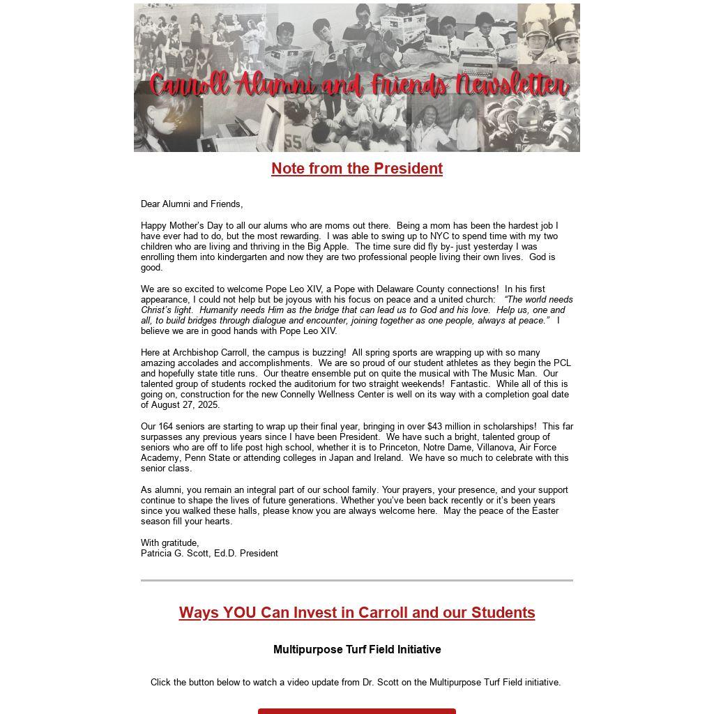 Here at Archbishop Carroll, the campus is buzzing! All spring sports are wrapping up with so many amazing accolades and accomplishments. We are so proud of our student athletes as they begin the PCL and hopefully state title runs. Our theatre ensemble put on quite the musical with The Music Man. Our talented group of students rocked the auditorium for two straight weekends! Fantastic. While all of this is going on, construction for the new Connelly Wellness Center is well on its way with a completion goal date of August 27, 2025.