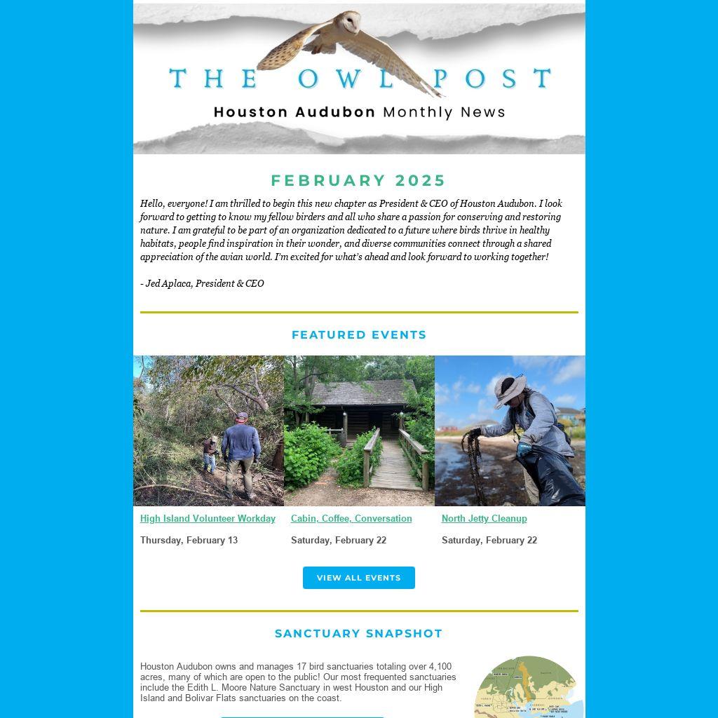 Hello, everyone! I am thrilled to begin this new chapter as President & CEO of Houston Audubon. I look forward to getting to know my fellow birders and all who share a passion for conserving and restoring nature. I am grateful to be part of an organization dedicated to a future where birds thrive in healthy habitats, people find inspiration in their wonder, and diverse communities connect through a shared appreciation of the avian world. I’m excited for what’s ahead and look forward to working together!