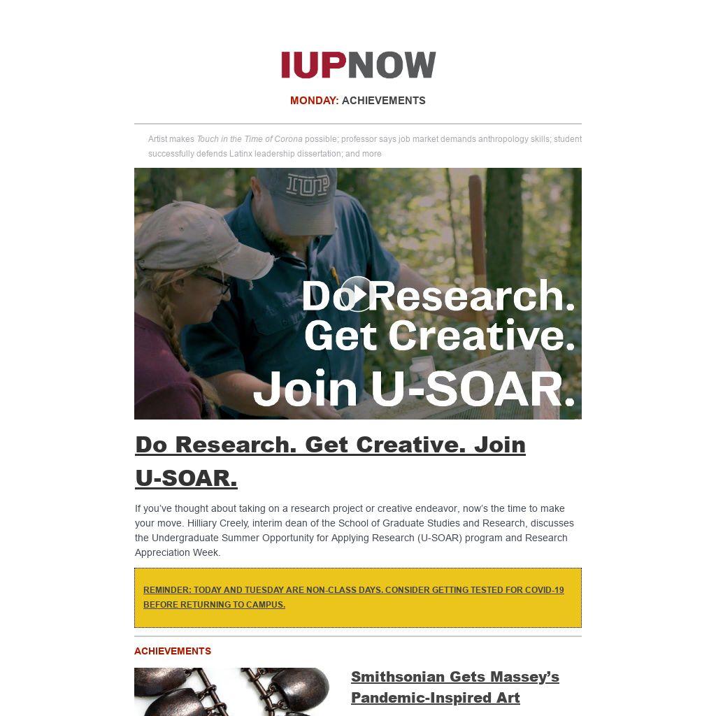 Distributed to IUP employees and students four days a week, IUP Now is the official newsletter of Indiana University of Pennsylvania. It features news from across the IUP website, compiled by the Division of Marketing and Communications. Find out how to get your news and events in IUP Now.