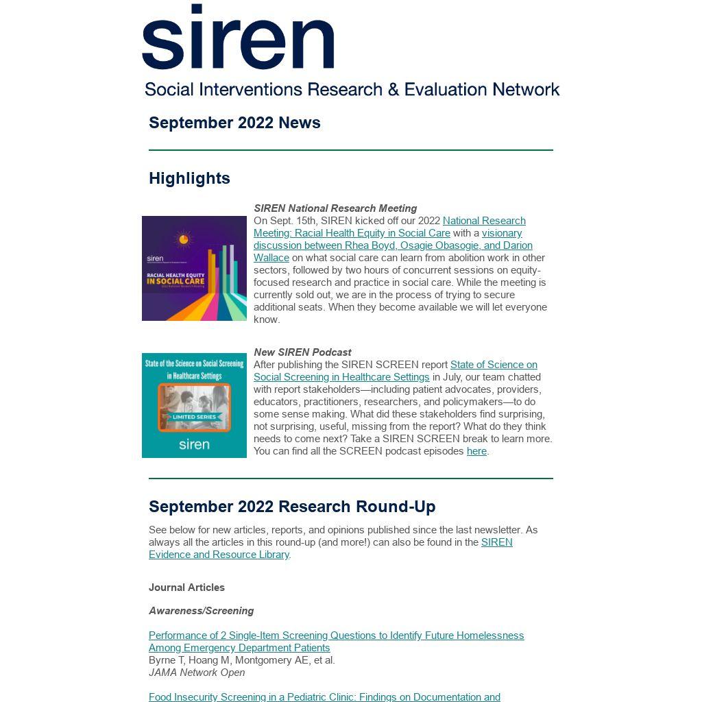 You are receiving this email because either you signed up to receive updates from SIREN or we feel that your work aligns well with SIREN and that the resources we provide will be of use to you. If you no longer wish to receive emails from SIREN please unsubscribe by clicking the link below.