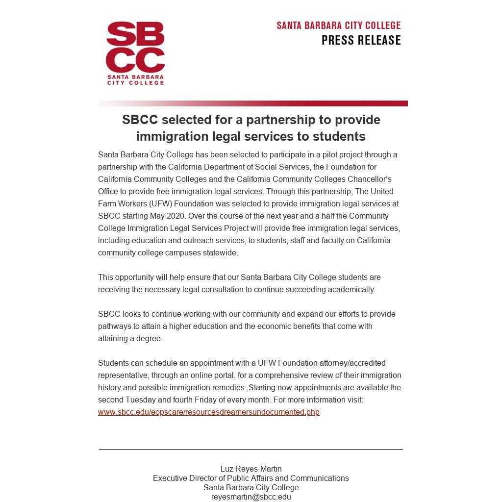 Santa Barbara City College has been selected to participate in a pilot project through a partnership with the California Department of Social Services, the Foundation for California Community Colleges and the California Community Colleges Chancellor’s Office to provide free immigration legal services. Through this partnership, The United Farm Workers (UFW) Foundation was selected to provide immigration legal services at SBCC starting May 2020. Over the course of the next year and a half the Community College Immigration Legal Services Project will provide free immigration legal services, including education and outreach services, to students, staff and faculty on California community college campuses statewide.
