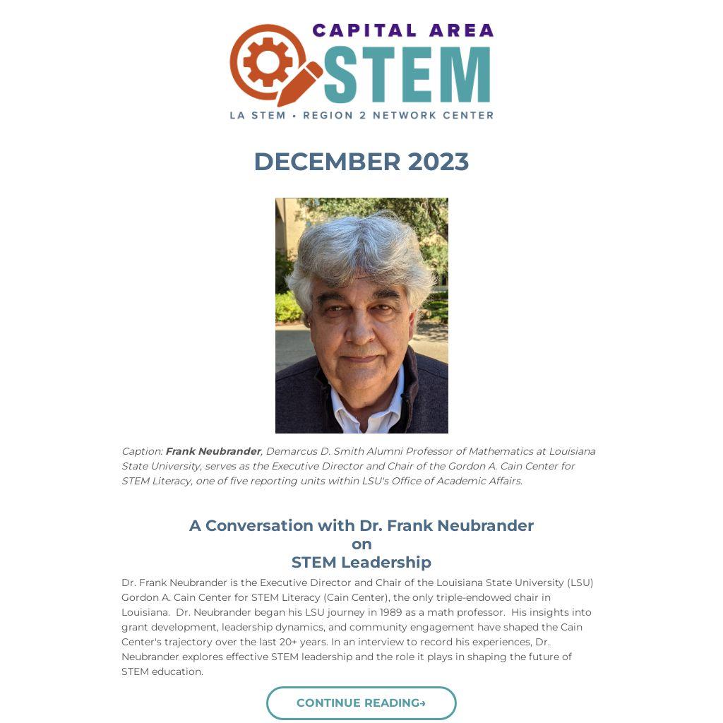 Dr. Frank Neubrander is the Executive Director and Chair of the Louisiana State University (LSU) Gordon A. Cain Center for STEM Literacy (Cain Center), the only triple-endowed chair in Louisiana. Dr. Neubrander began his LSU journey in 1989 as a math professor. His insights into grant development, leadership dynamics, and community engagement have shaped the Cain Center's trajectory over the last 20+ years. In an interview to record his experiences, Dr. Neubrander explores effective STEM leadership and the role it plays in shaping the future of STEM education.