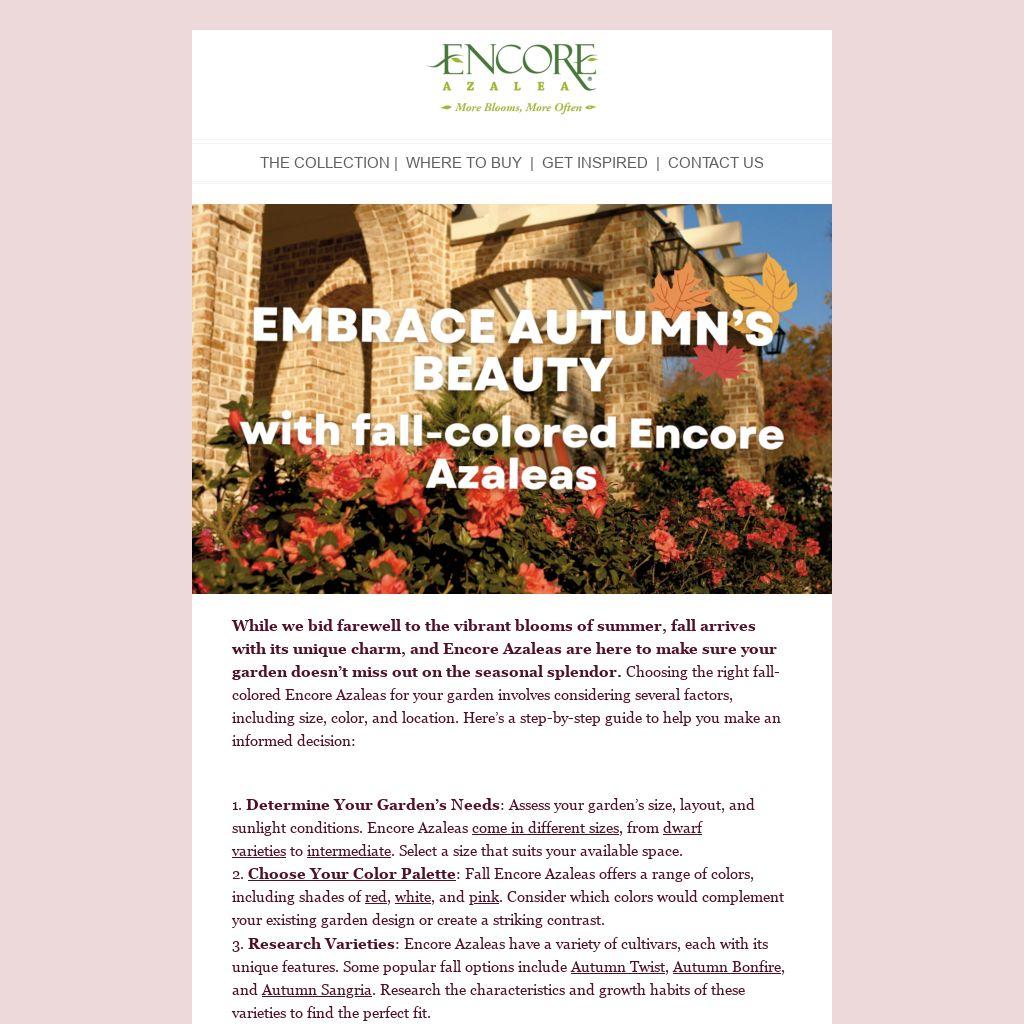 While we bid farewell to the vibrant blooms of summer, fall arrives with its unique charm, and Encore Azaleas are here to make sure your garden doesn’t miss out on the seasonal splendor. Choosing the right fall-colored Encore Azaleas for your garden involves considering several factors, including size, color, and location. Here’s a step-by-step guide to help you make an informed decision: