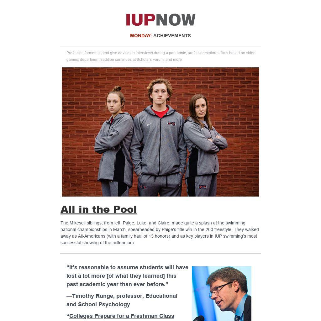 The Mikesell siblings, from left, Paige, Luke, and Claire, made quite a splash at the swimming national championships in March, spearheaded by Paige’s title win in the 200 freestyle. They walked away as All-Americans (with a family haul of 13 honors) and as key players in IUP swimming’s most successful showing of the millennium.