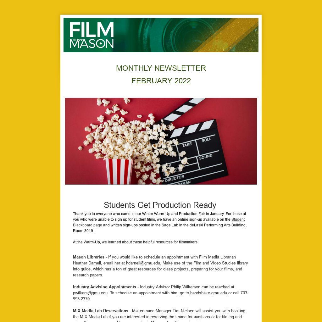 We want to hear from you! If you have news you would like to contribute, please send it to film@gmu.edu. We are looking for regional film events and updates from Film at Mason alumni. Keep up-to-date on all the current Film at Mason news at film.gmu.edu.