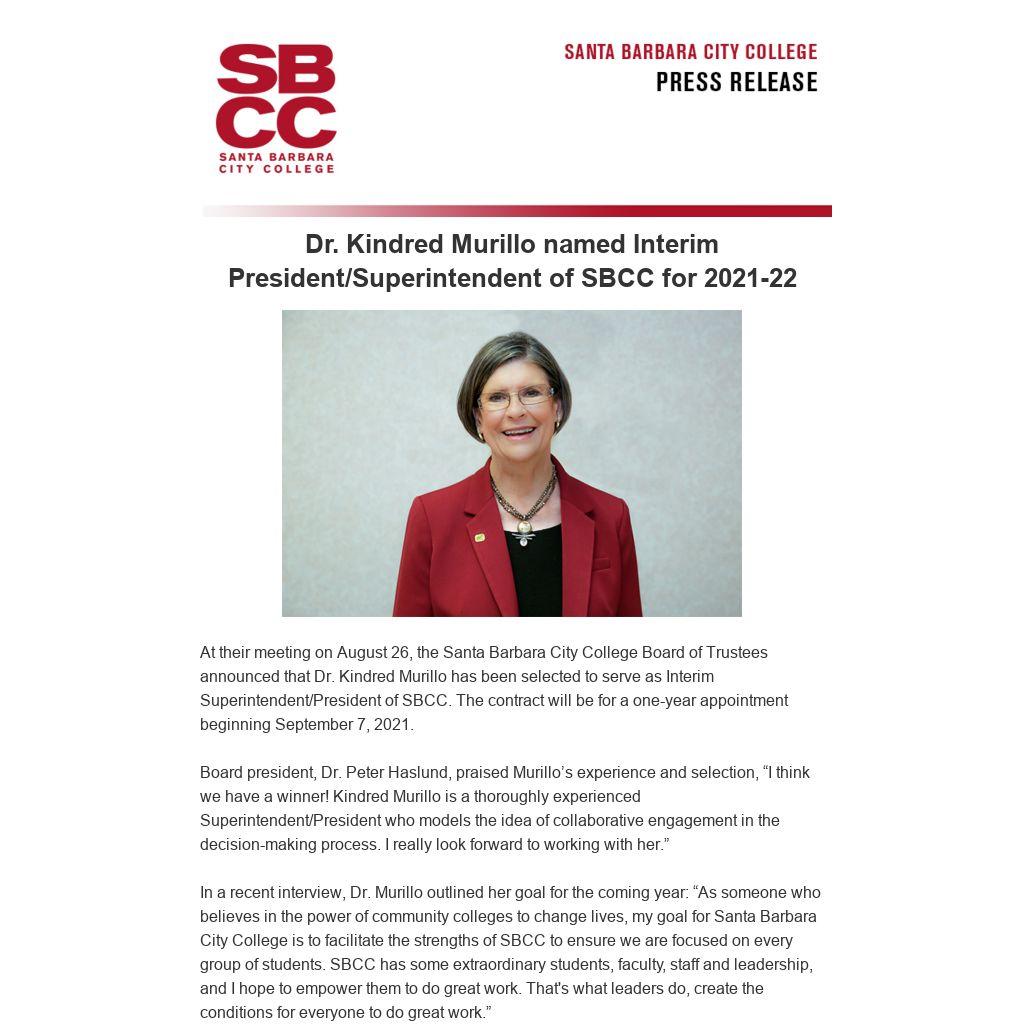 At their meeting on August 26, the Santa Barbara City College Board of Trustees announced that Dr. Kindred Murillo has been selected to serve as Interim Superintendent/President of SBCC. The contract will be for a one-year appointment beginning September 7, 2021.