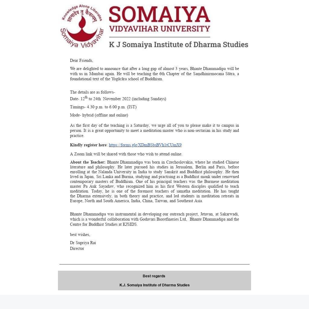 We are delighted to announce that after a long gap of almost 3 years, Bhante Dhammadipa will be with us in Mumbai again. He will be teaching the 6th Chapter of the Saṃdhinirmocana Sūtra, a foundational text of the Yogācāra school of Buddhism.