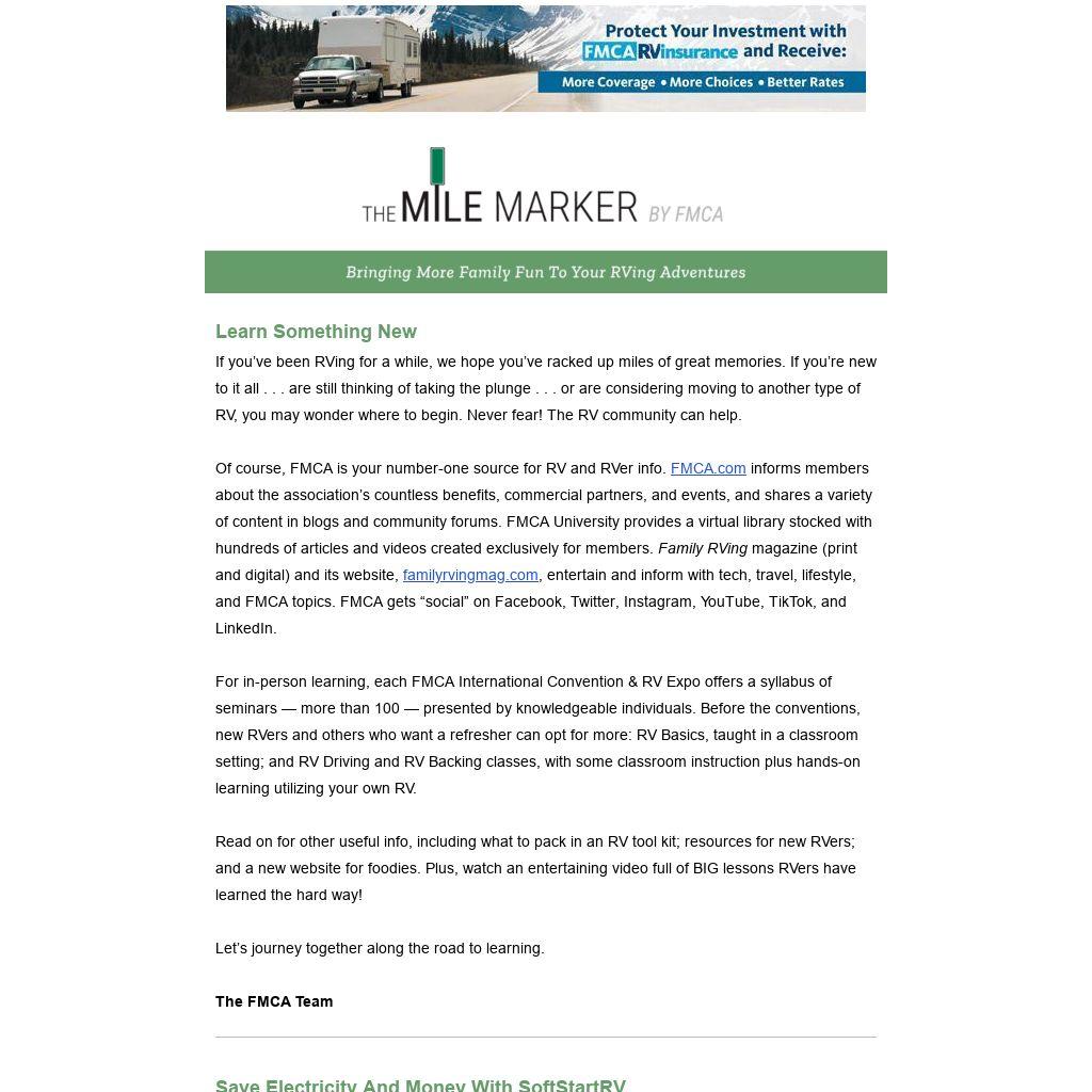 Of course, FMCA is your number-one source for RV and RVer info. FMCA.com informs members about the association’s countless benefits, commercial partners, and events, and shares a variety of content in blogs and community forums. FMCA University provides a virtual library stocked with hundreds of articles and videos created exclusively for members. Family RVing magazine (print and digital) and its website, familyrvingmag.com, entertain and inform with tech, travel, lifestyle, and FMCA topics. FMCA gets “social” on Facebook, Twitter, Instagram, YouTube, TikTok, and LinkedIn.