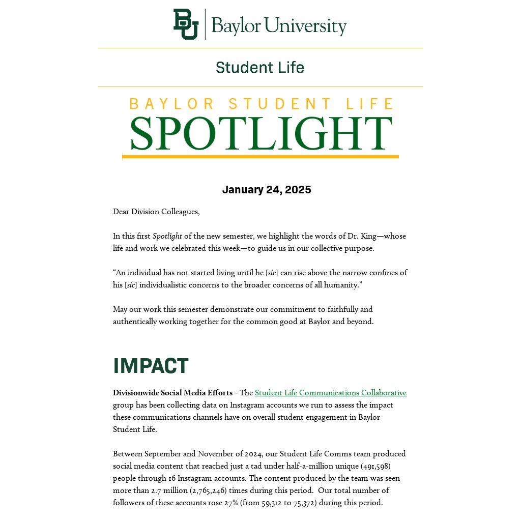 Divisionwide Social Media Efforts – The Student Life Communications Collaborative group has been collecting data on Instagram accounts we run to assess the impact these communications channels have on overall student engagement in Baylor Student Life.