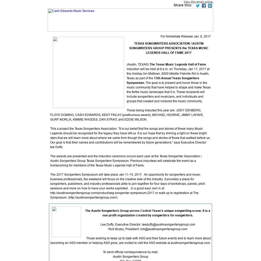 TEXAS SONGWRITERS ASSOCIATION / AUSTIN SONGWRITERS GROUP PRESENTS the TEXAS MUSIC LEGENDS HALL OF FAME 2017