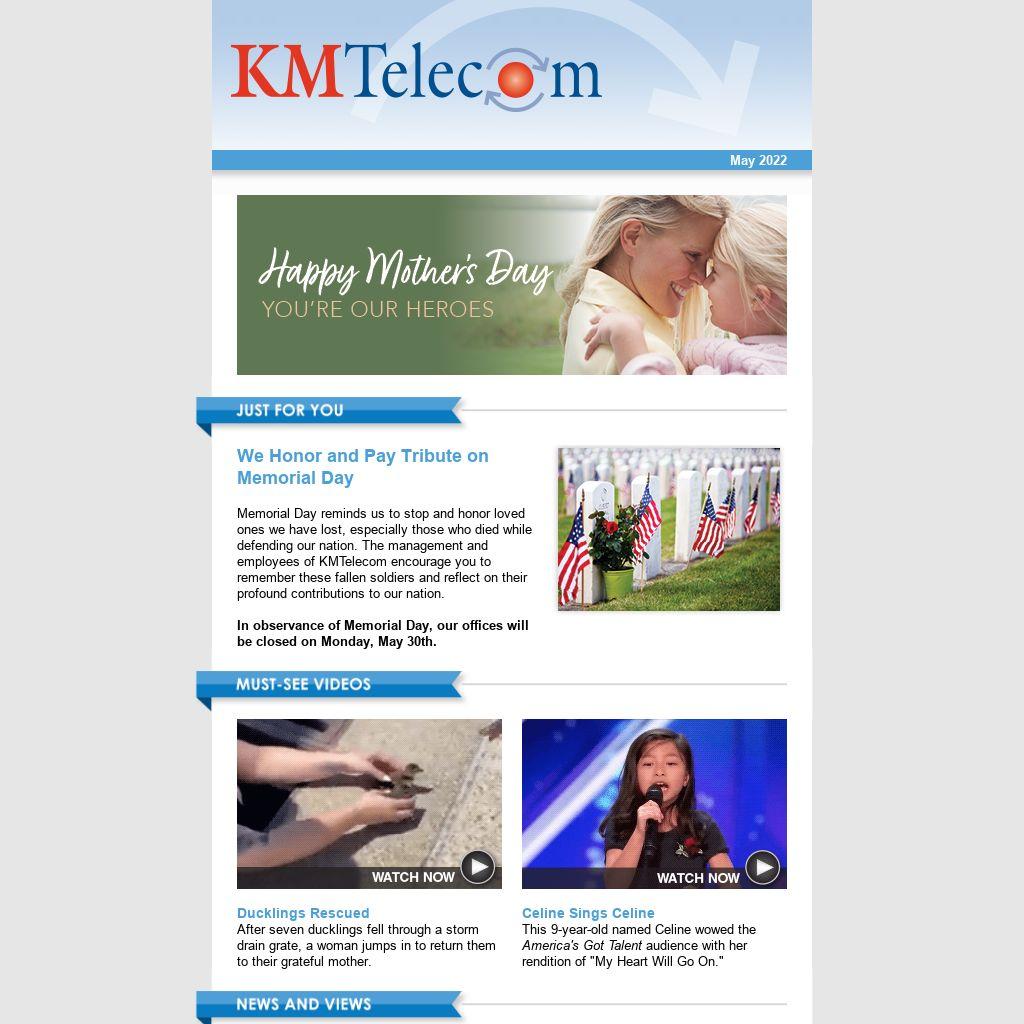 Memorial Day reminds us to stop and honor loved ones we have lost, especially those who died while defending our nation. The management and employees of KMTelecom encourage you to remember these fallen soldiers and reflect on their profound contributions to our nation. In observance of Memorial Day, our offices will be closed on Monday, May 30th. |