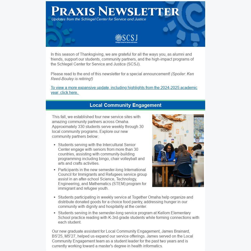 After much reflection and discernment, I have decided to retire at the end of December. I am so grateful for more than 26 years at the Schlegel Center for Service and Justice and 37 years in education. I am incredibly proud of all we have accomplished together, and I know the SCSJ Staff and student leaders are ready to continue and strengthen the SCSJ’s mission-centric work. Our programs have never been more impactful in scope, depth, and leadership. Thank you for your participation, support, and prayers through the years, as together we continue to cultivate a more loving and just world!
