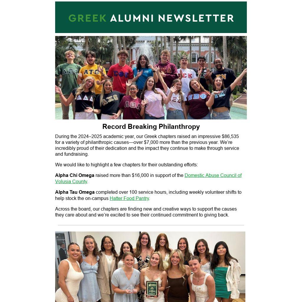 During the 2024–2025 academic year, our Greek chapters raised an impressive $86,535 for a variety of philanthropic causes—over $7,000 more than the previous year. We’re incredibly proud of their dedication and the impact they continue to make through service and fundraising.