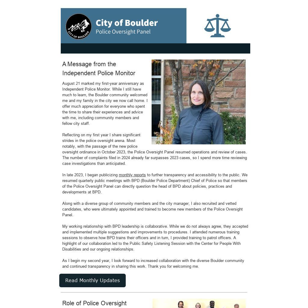In Boulder, the Police Oversight Panel and the Office of the Independent Police Monitor play key roles in these areas, working together to review complaints, recommend disciplinary actions, and suggest policy changes.