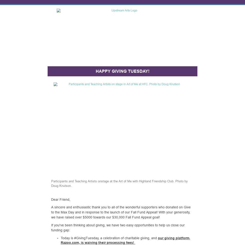 You can also set Upstream Arts as your charitable organization on smile.amazon.com, and Amazon will donate 0.5% of the price of everything you purchase to our cause.