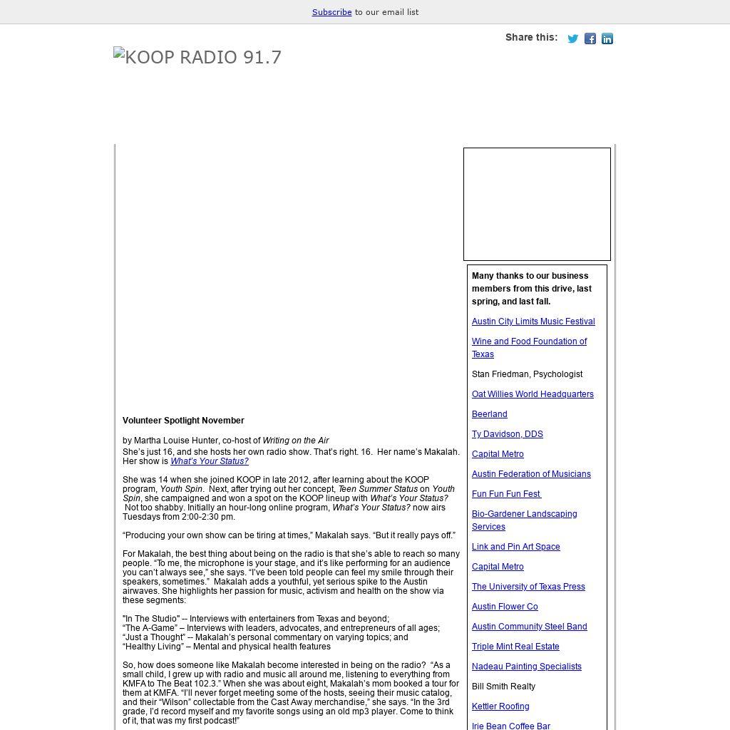 She was 14 when she joined KOOP in late 2012, after learning about the KOOP program, Youth Spin. Next, after trying out her concept, Teen Summer Status on Youth Spin, she campaigned and won a spot on the KOOP lineup with What’s Your Status? Not too shabby. Initially an hour-long online program, What’s Your Status? now airs Tuesdays from 2:00-2:30 pm.