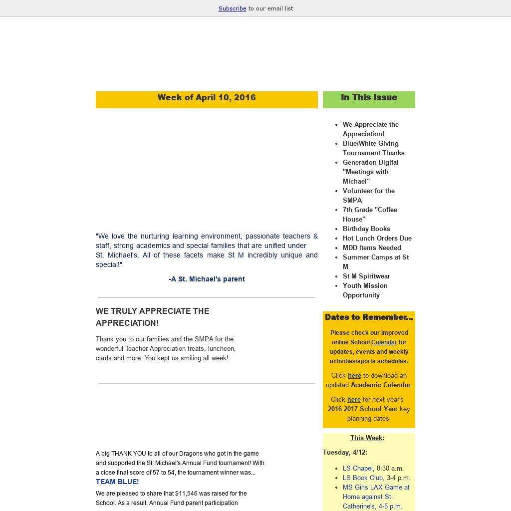 Community. Curriculum. Culture. Get connected to keep abreast of St M news, events, calendar changes and information. Current and past issues of "This Week at St. Michael's" are now archived on our website under "News and Events," as well as under "Community."