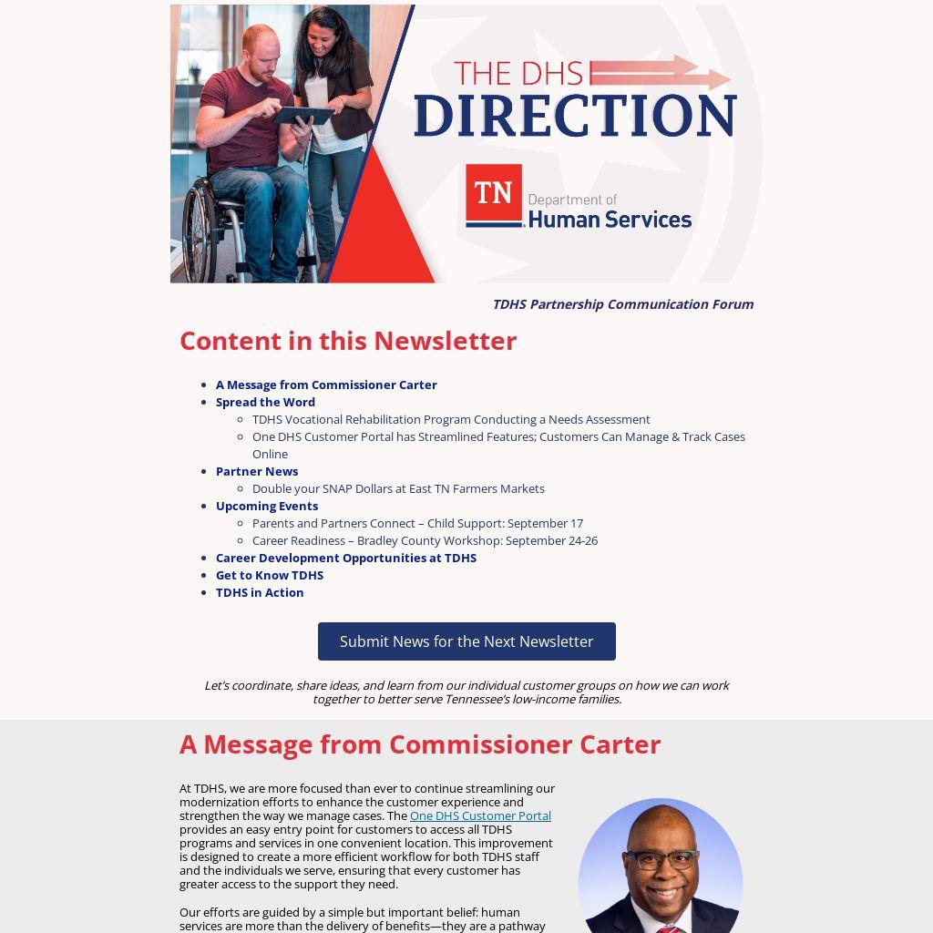 The Tennessee Department of Human Services (TDHS) consists of multiple divisions with a unified mission to strengthen Tennessee by strengthening Tennesseans. Led by governor-appointed Commissioner Clarence H. Carter, TDHS serves nearly two million Tennesseans to ensure that all state residents have an opportunity to reach their full potential as contributing members of their community. Among the many services and programs provided by TDHS, some of the leading programs include the Child Support Program, Child and Adult Day Services and Licensing, Families First (the state’s Temporary Assistance for Needy Families (TANF), Supplemental Nutrition Assistance Program (SNAP), Rehabilitation Services for people with disabilities, and Adult Protective Services, along with many others. TDHS is an organization committed to connecting people to resources that help individuals, families and communities thrive towards long-term economic freedom and prosperity.