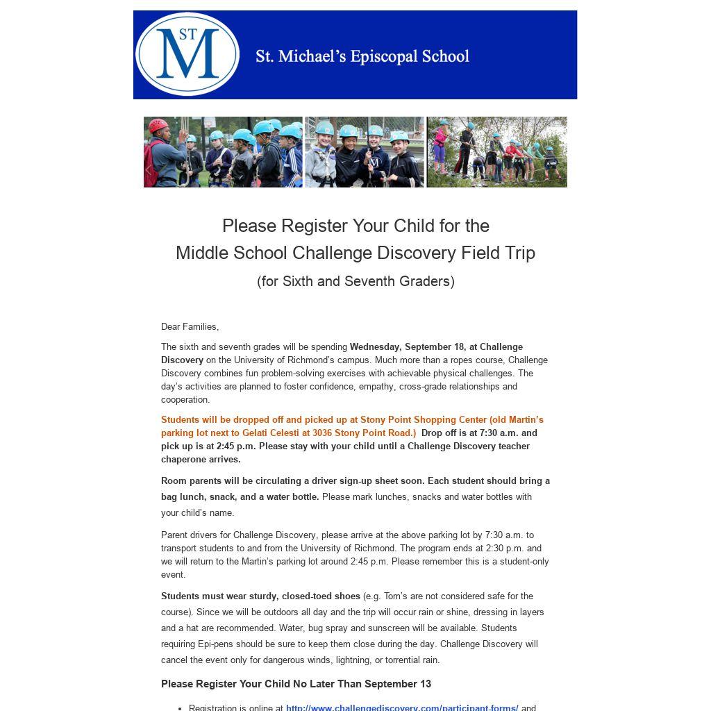 - Registration is online at http://www.challengediscovery.com/participant-forms/ and must be completed by the end of day on Friday, September 13. Thank you for your help in registering your sixth or seventh grader ASAP.