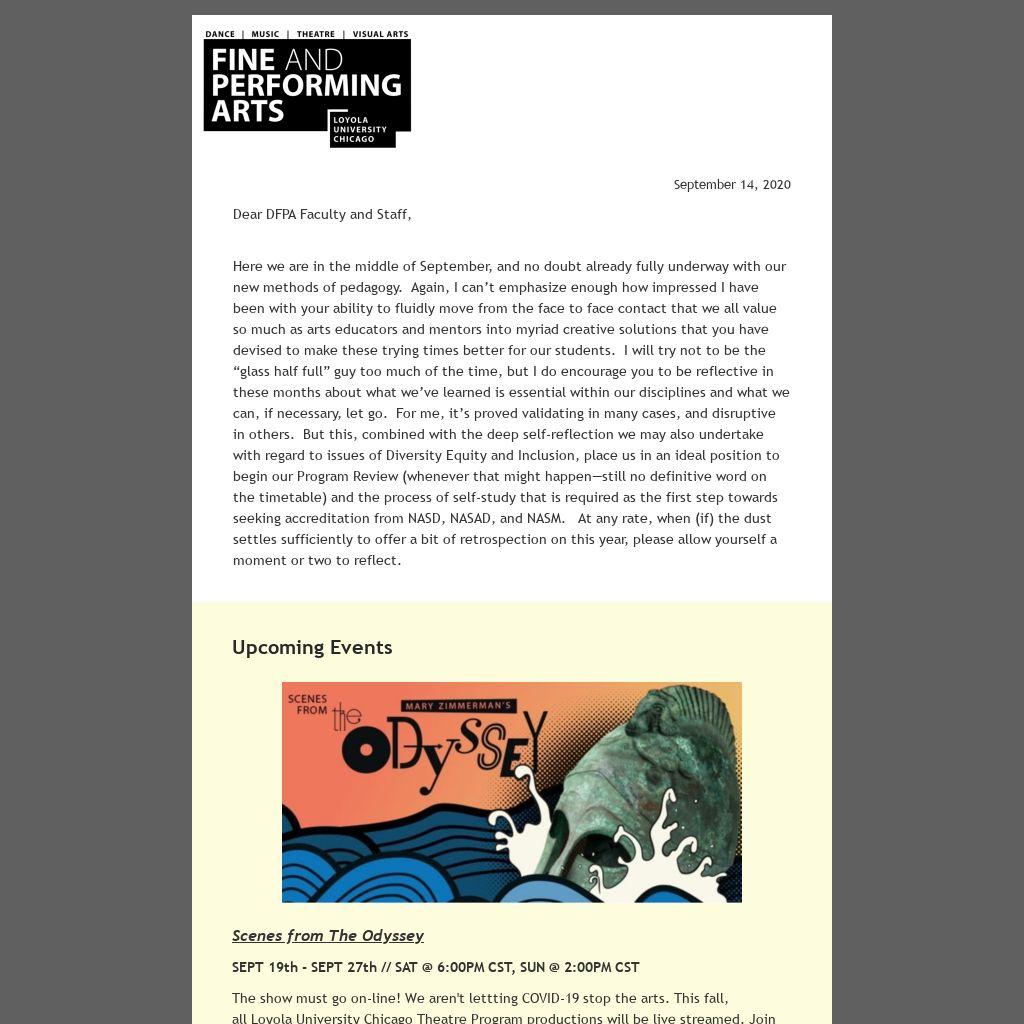 Here we are in the middle of September, and no doubt already fully underway with our new methods of pedagogy. Again, I can’t emphasize enough how impressed I have been with your ability to fluidly move from the face to face contact that we all value so much as arts educators and mentors into myriad creative solutions that you have devised to make these trying times better for our students. I will try not to be the “glass half full” guy too much of the time, but I do encourage you to be reflective in these months about what we’ve learned is essential within our disciplines and what we can, if necessary, let go. For me, it’s proved validating in many cases, and disruptive in others. But this, combined with the deep self-reflection we may also undertake with regard to issues of Diversity Equity and Inclusion, place us in an ideal position to begin our Program Review (whenever that might happen—still no definitive word on the timetable) and the process of self-study that is required as the first step towards seeking accreditation from NASD, NASAD, and NASM. At any rate, when (if) the dust settles sufficiently to offer a bit of retrospection on this year, please allow yourself a moment or two to reflect.