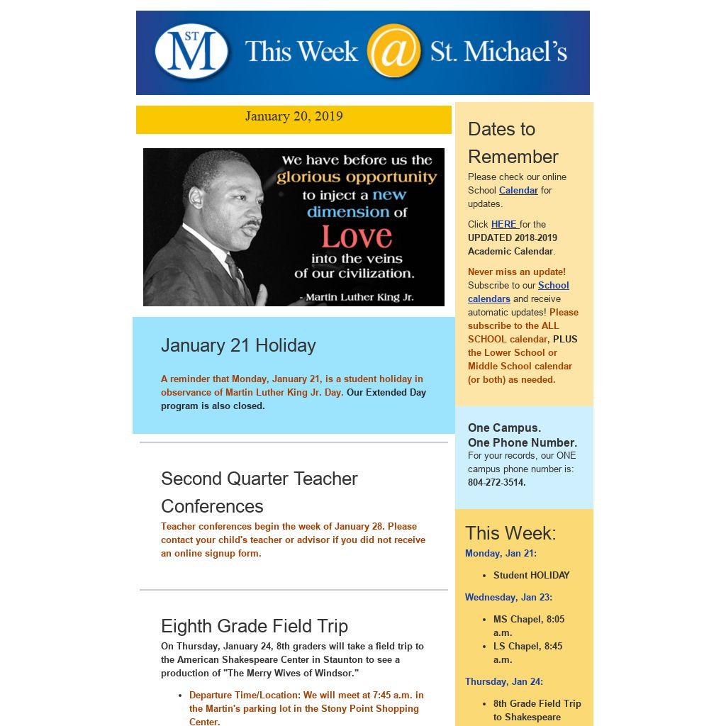 At St. Michael's, we strongly value student engagement in service around our Richmond community. As has become annual practice nationwide, we encourage students and their families to serve their communities on MLK Day as a way of honoring the work of Martin Luther King.