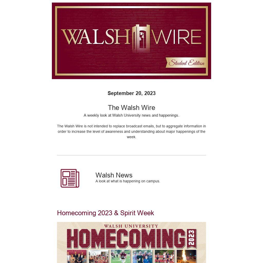 It’s Spirit Week! Show your pride by wearing Walsh gear to the 2023 Homecoming activities. From sporting events and tailgating to a concert, you will not want to miss all the activities planned for this weekend, beginning today!