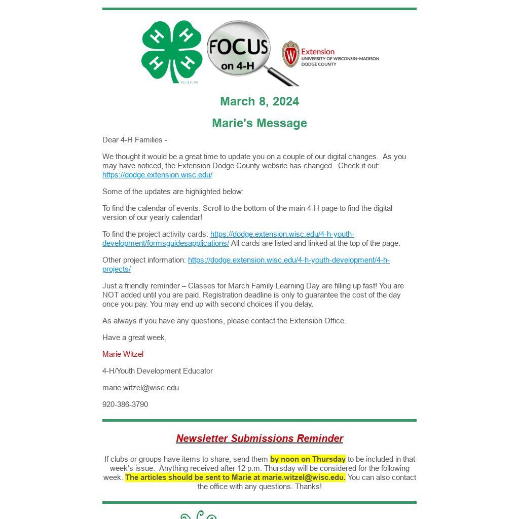 If clubs or groups have items to share, send them by noon on Thursday to be included in that week’s issue. Anything received after 12 p.m. Thursday will be considered for the following week. The articles should be sent to Marie at marie.witzel@wisc.edu. You can also contact the office with any questions. Thanks!