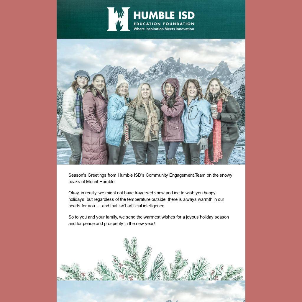 Season’s Greetings from Humble ISD’s Community Engagement Team on the snowy peaks of Mount Humble!
